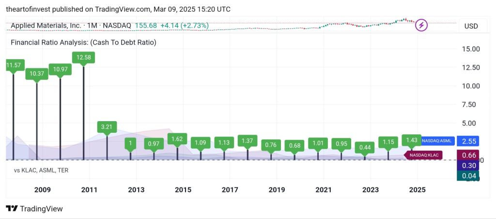 While AMAT’s ROE is strong, KLAC significantly outperforms. AMAT’s cash-to-debt ratio of 1.43 suggests a manageable debt level, ensuring financial flexibility.