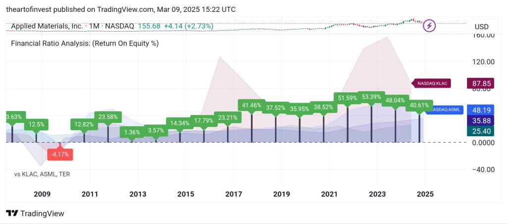 AMAT maintains a strong gross margin but lags behind KLAC and ASML. However, its operating margin of 28.95% demonstrates effective cost control and efficient operations.