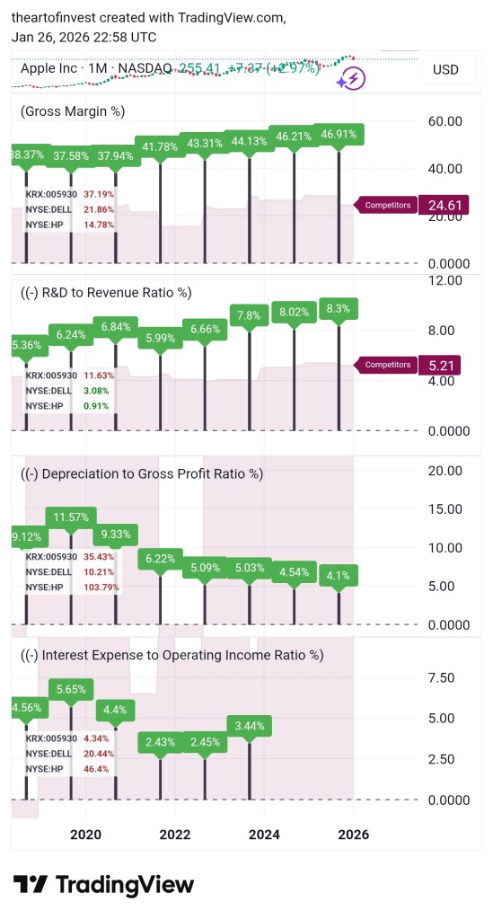 Beyond ecosystem lock-in, Apple demonstrates significant intangible assets through its design and engineering capabilities. The firm’s vertically integrated approach—combining hardware, software, and in-house semiconductor design—enables differentiated performance, power efficiency, security, and time-to-market advantages.