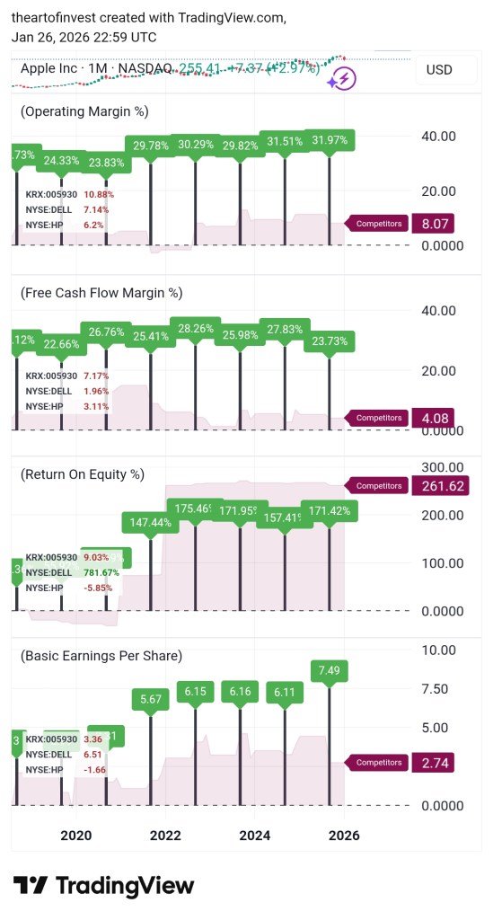 Capital efficiency metrics further reinforce this assessment. Apple’s return on equity remains persistently high, supported by strong operating performance and an asset-light manufacturing model. Earnings per share growth has been stable across cycles, reflecting both operating leverage and disciplined capital return policies.