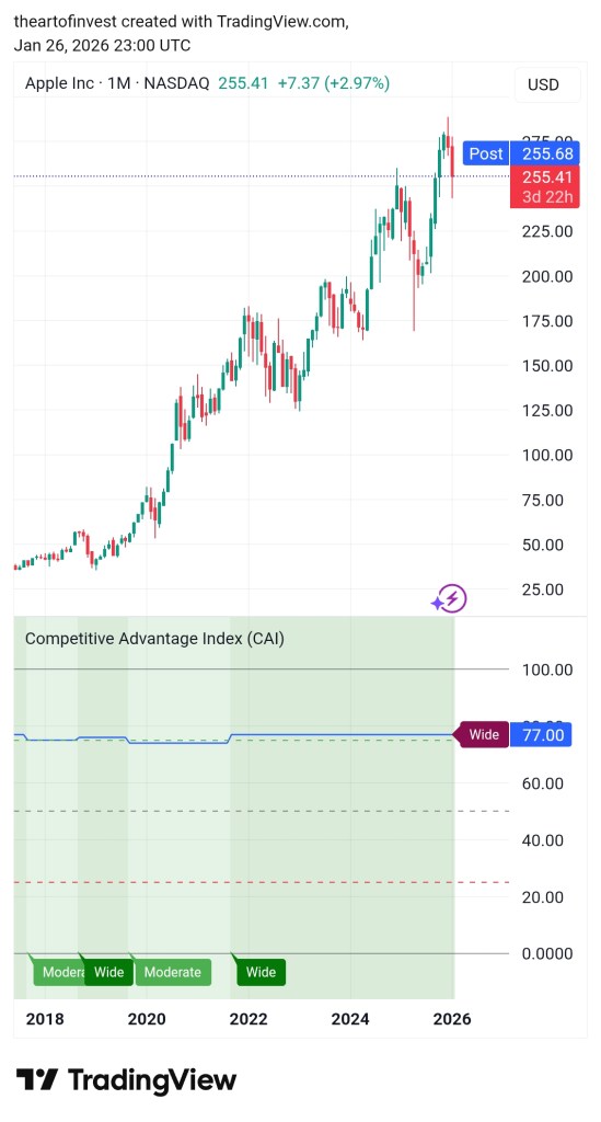 The Competitive Advantage Index (CAI) remains firmly within the “Wide” range over an extended period, indicating sustained competitive strength rather than episodic advantage. The stability of the index suggests Apple’s moat is structural and enduring, rather than dependent on transient product cycles or favorable market conditions.